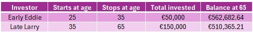 Let’s compare two investors: Early Eddie and Late Larry. Both of them decide to invest €5,000 a year at 7% annual returns, and both of them want to withdraw their cash at age 65.