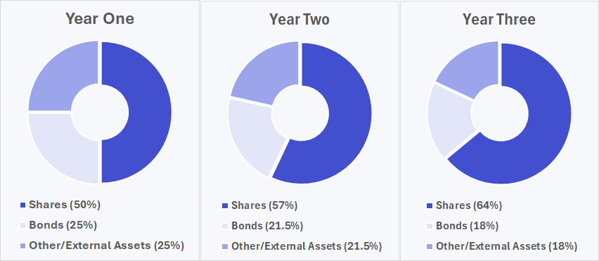 The example below shows what happens without rebalancing after three years of shares increasing by 20% and bonds and other assets falling by 10%.