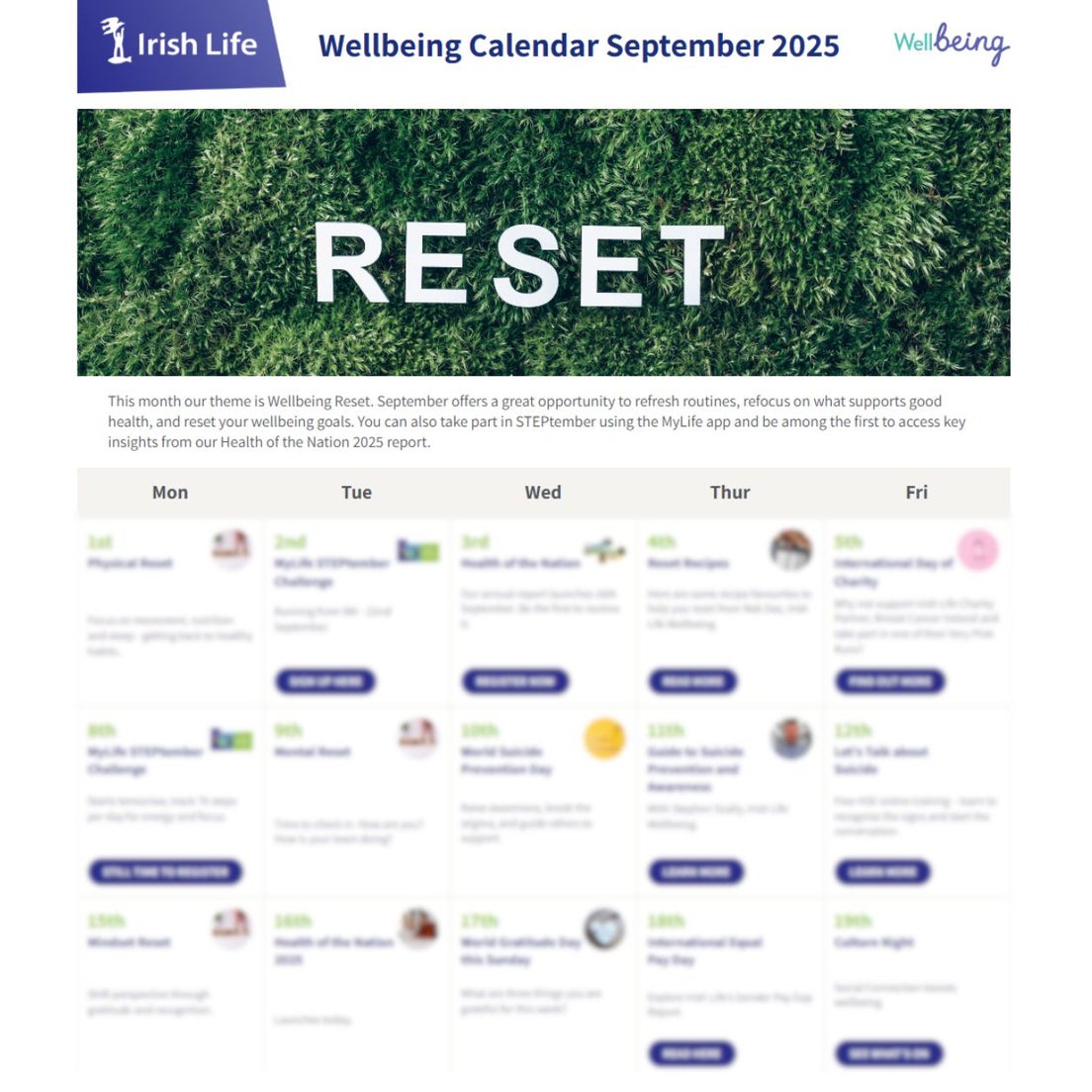 The Irish Life Wellbeing Calendar brings together themed wellbeing content each month, covering essential topics like nutrition, stress management, mens and womens health, mental wellbeing, and environmental health.